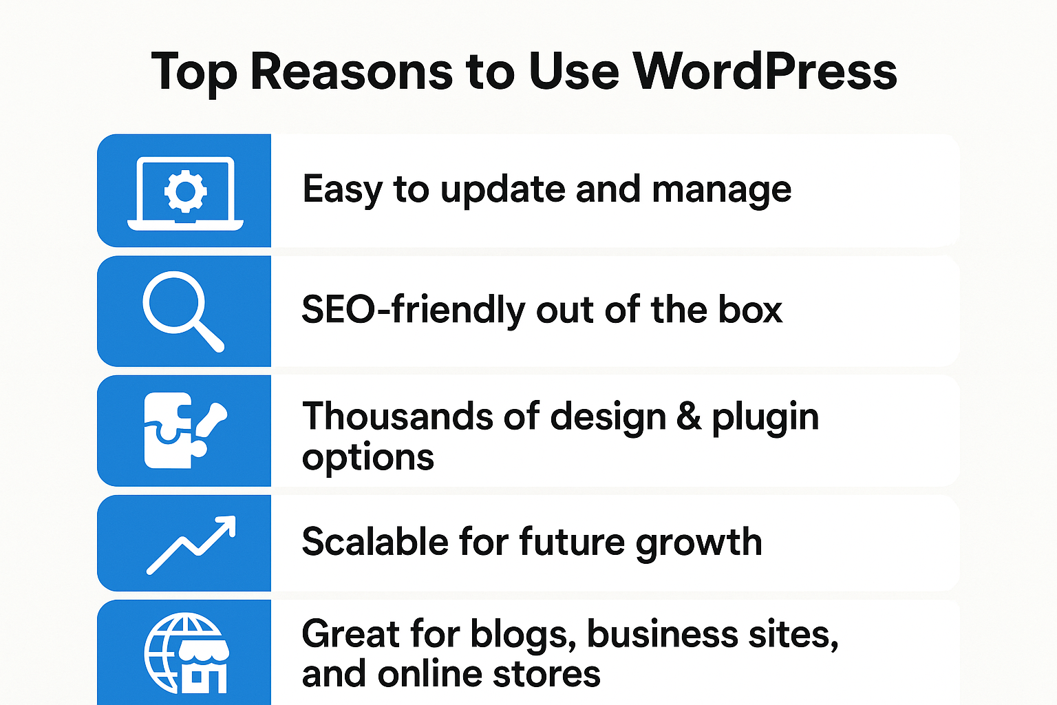 WordPress powers over 40% of all websites — and for good reason. It's flexible, secure, easy to manage, and perfect for businesses of all sizes.